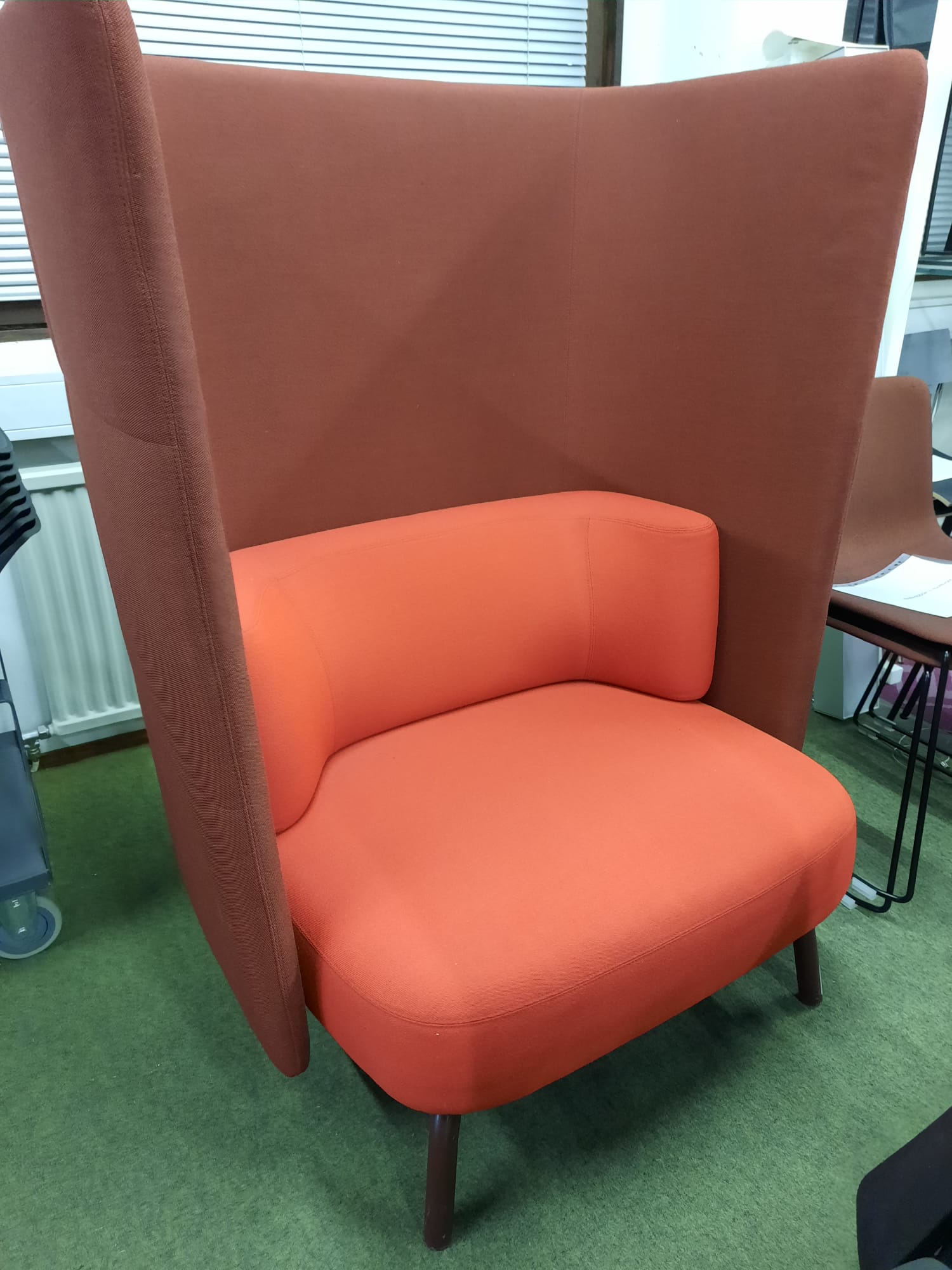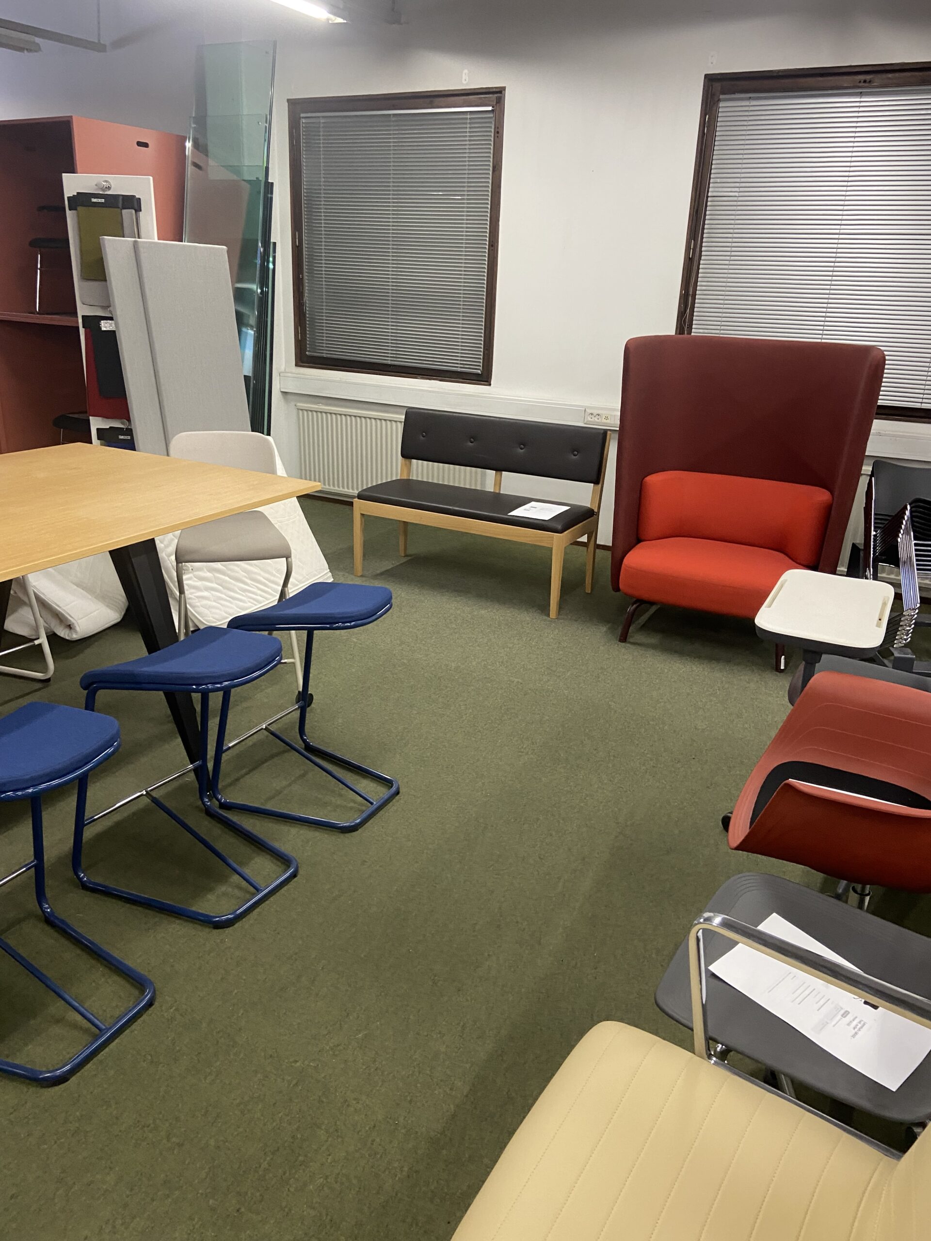 Väri: runko: tummanpunainen kangas, tyynyt: kirkkaanpunainen kangas, jalat: tummanpunainen metalli